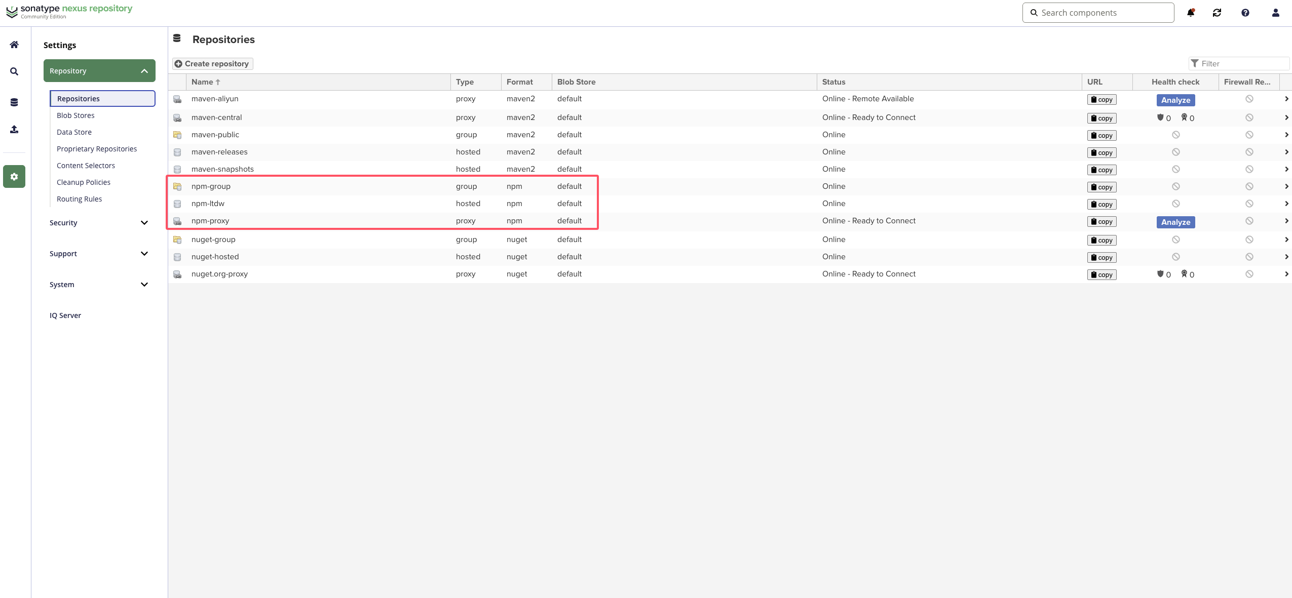 name: npm-group,是仓库组的名称。可以包含任何npm的仓库。最终npm install等操作时的地址将会是这个仓库组的地址。